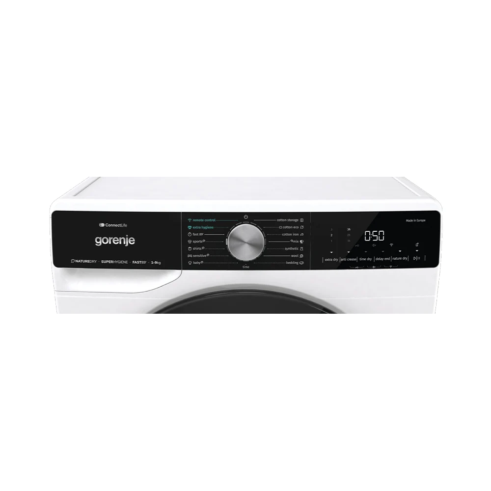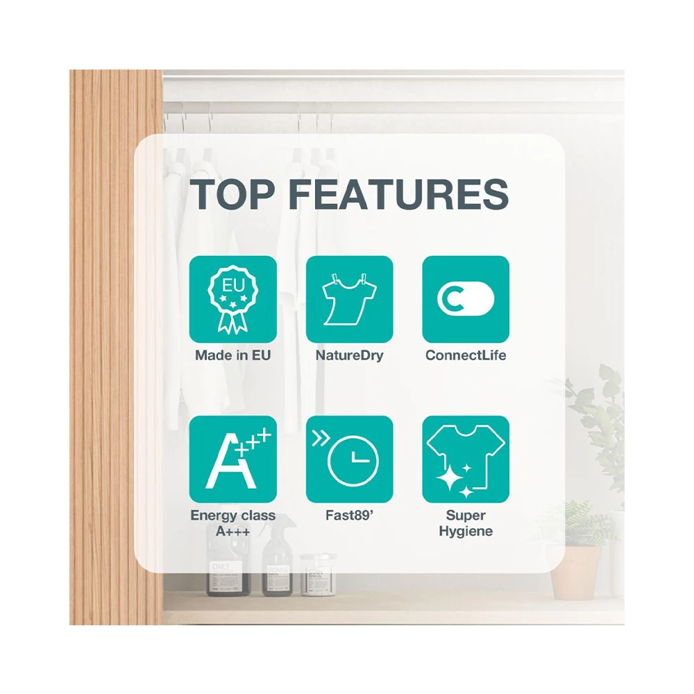 AntiCrease - sistem protiv gužvanja Polovično punjenje Podešavanje razine sušenja Vrijeme odgode Wi-Fi upravljanje ConnectLife LED displej Prikaz preostalog vremena rada Jednostavan interfejs Osvjetljenje bubnja |