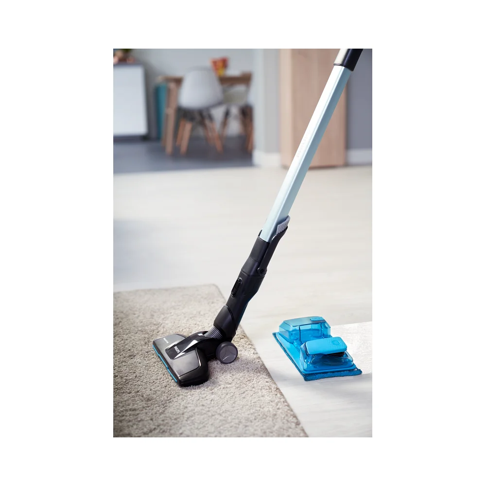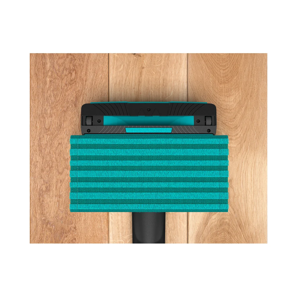 Jedinstveni sustav usisavanja i vlažnog brisanja regulira ispuštanje vode radi održavanja optimalne vlažnosti za sve vrste tvrdih podova tijekom cijelog postupka čišćenja. Jastučići od mikrovlakana mogu se prati ručno ili u perilici.