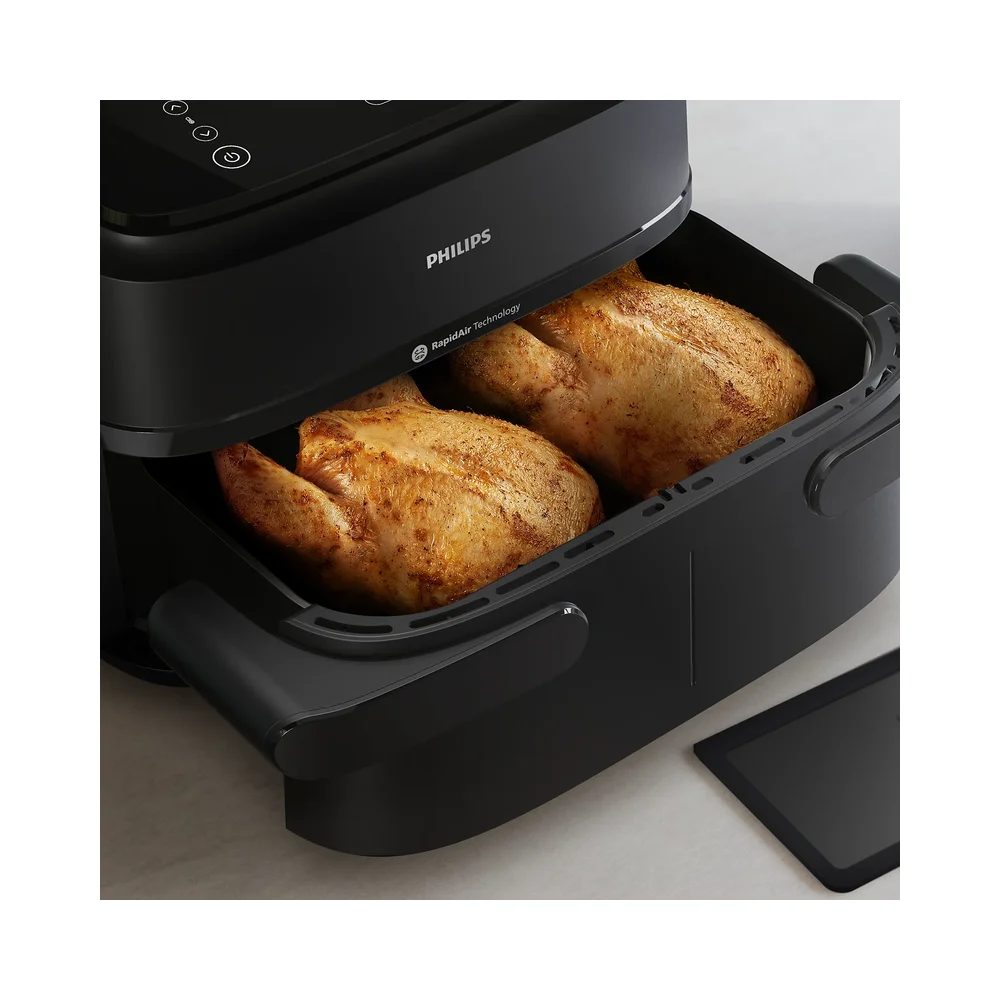 Uklonite razdjelnik kako biste spojili dvije košare od 3,55 l u jednu prostranu posudu za pečenje od 7,1 l. U nju stane 900 g krumpirića, 1200 g povrća ili 10 pilećih bataka. Osim toga, u velikoj košari možete ispeći dva cijela pileta od 1 kg.
