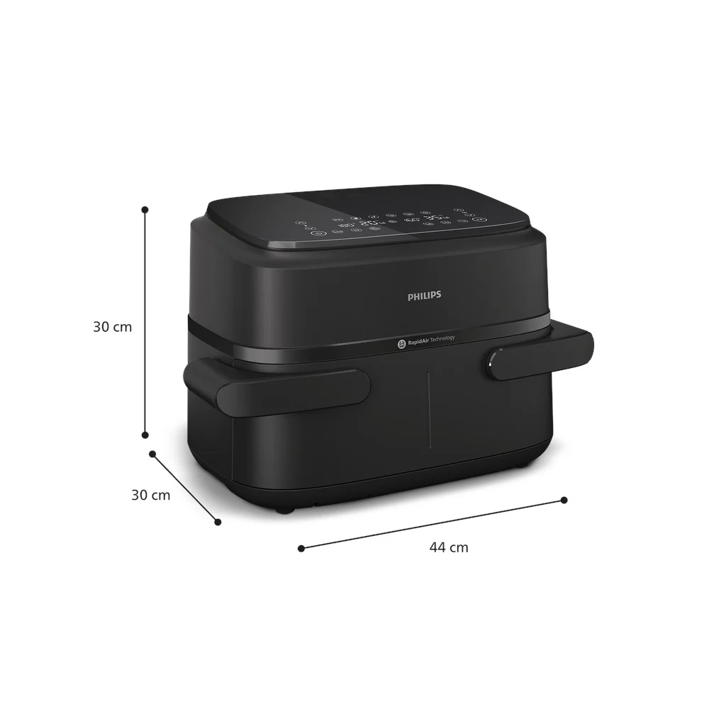 Uz naš kompaktni aparat Airfryer s dvije košare uštedjet ćete 40 % prostora.** Ladica uključuje dvije čvrste vodoravne ručke za sigurno, udobno rukovanje čak i kad je puna.
