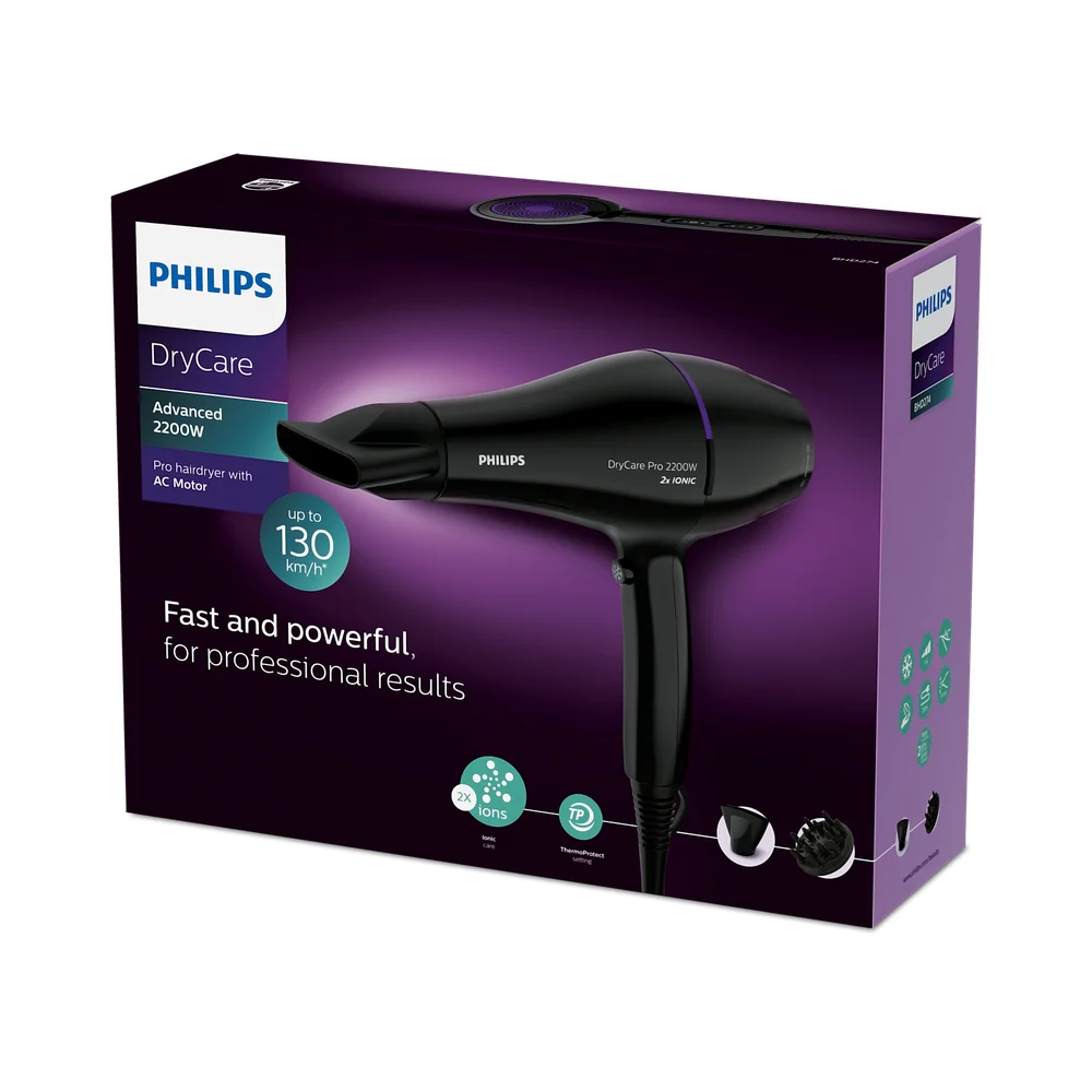 Sušilo za kosu Philips Pro ima profesionalni AC motor koji doseže brzinu protoka zraka do 130 km/h* kako bi se postigli brzi i profesionalni rezultati. Ima i postavku ThermoProtect za optimalnu temperaturu koja štiti od pregrijavanja.