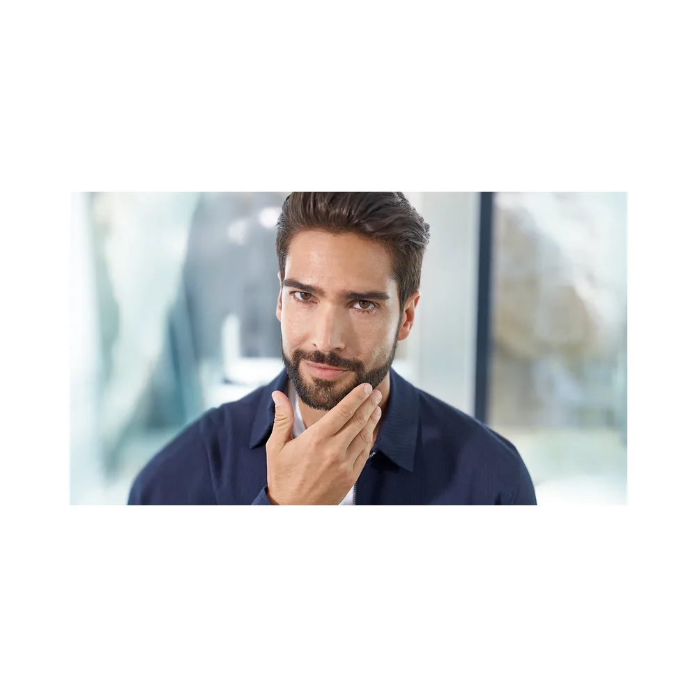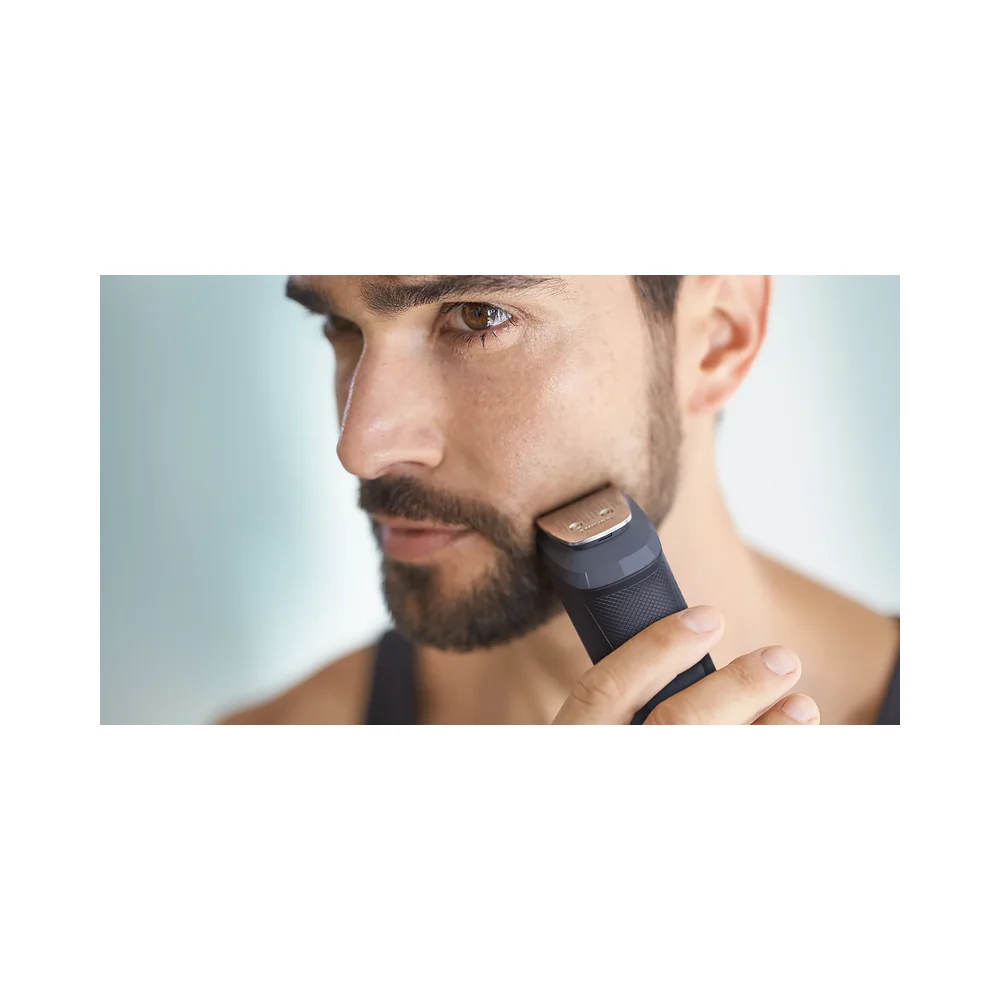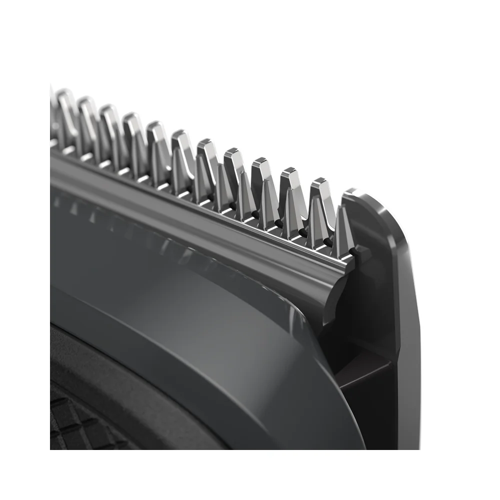 Koristite metalni trimer s tehnologijom DualCut bez češlja kako biste postigli čiste, oštre linije oko rubova brade, vrata i kose.