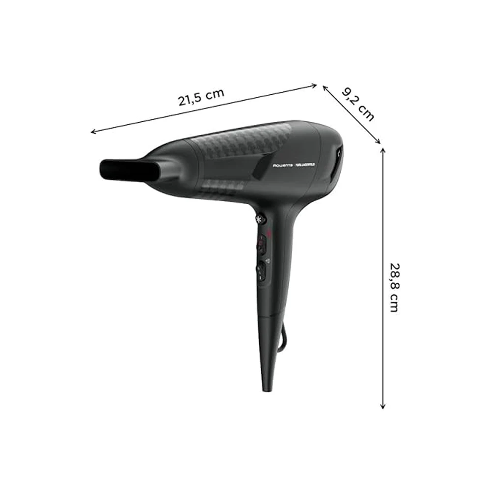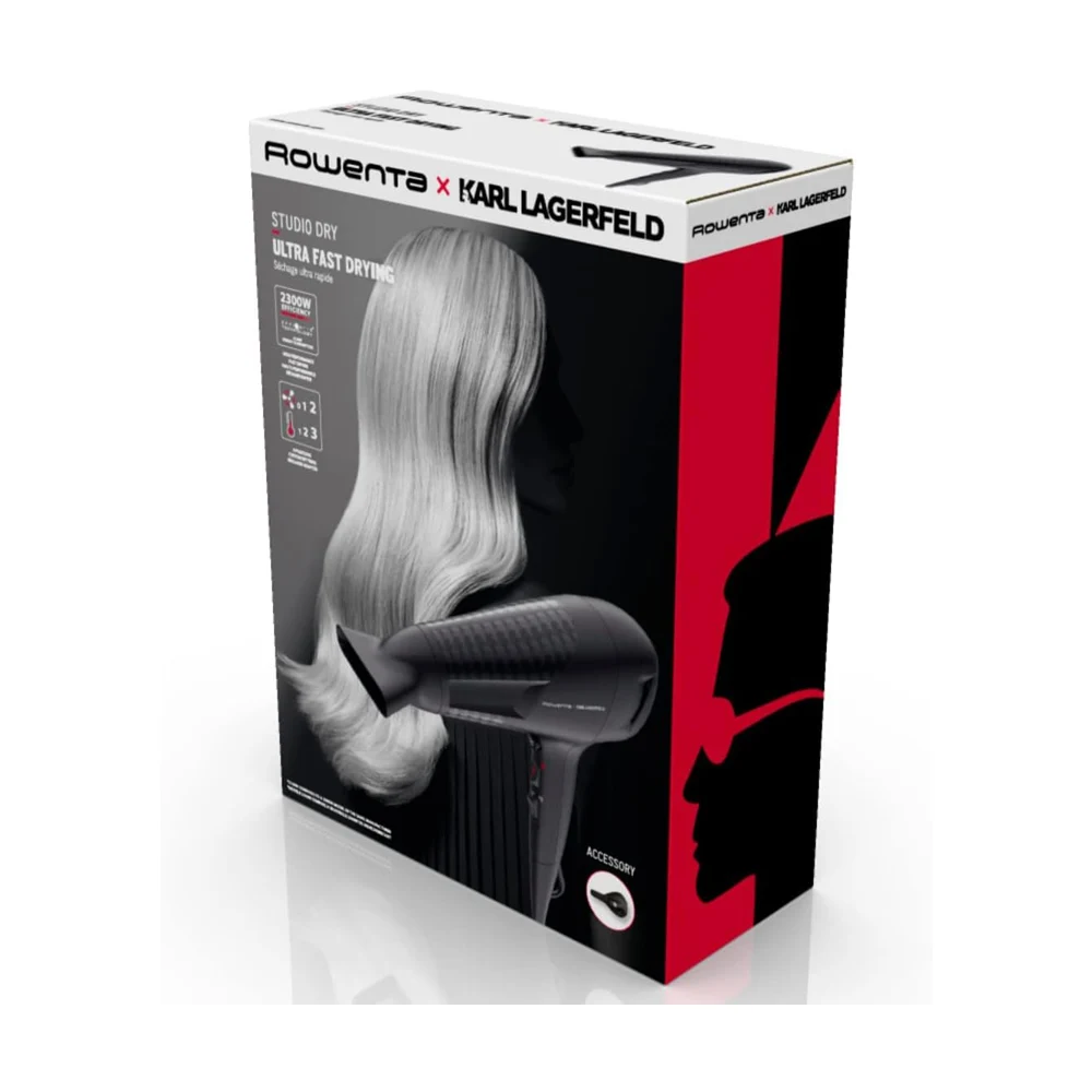 Brzo sušenje bez muke: Rowenta x KARL LAGERFELD Studio fen za sušenje osigurava besprijekorno sušenje i privlačan stil. 2300 effivata snage za uštedu energije nudi savršene rezultate sušenja u kratkom roku, dok funkcija Thermo Control štiti kosu od prekomjerne toplote i održava punu ljepotu iz dana u dan. Lako podesive postavke brzine/temperature nude potpunu kontrolu stiliziranja, s tankim usmjerivačem za oblikovanje do najsitnijih detalja i još mnogo toga.